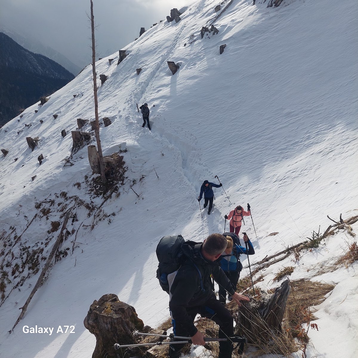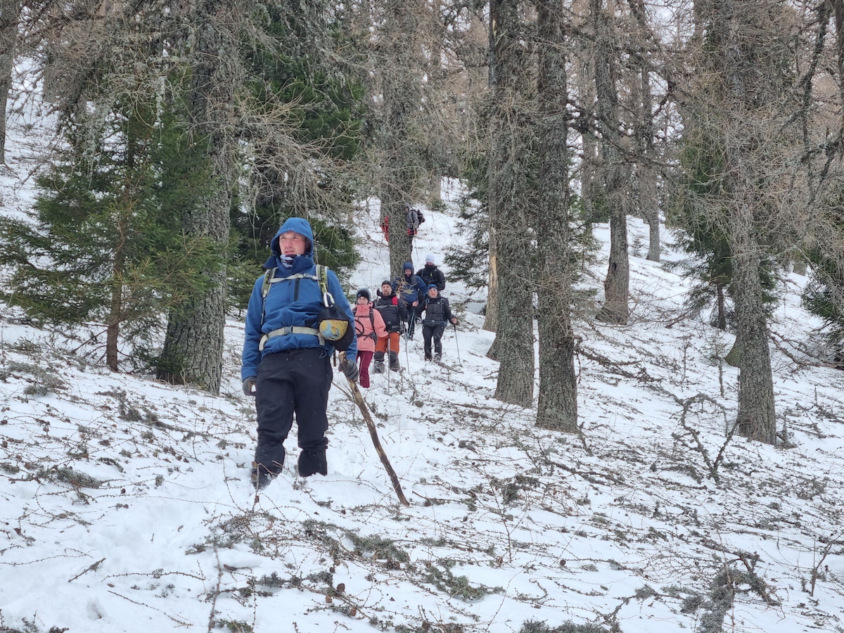 Pot nas je sprva vodila po složno vzpenjajoči se makadamski poti skozi dolino Dol, kjer so nas spremljale še sveže rane vetroloma, ki je tod lomastil le nekaj dni poprej. Po krajšem postanku smo zagrizli v strm breg, ki ga je tu in tam presekal kolovoz. Z naraščajočo višino je sprva kopna steza vse bolj prehajala v zasneženo belino, pot pa smo si morali z vztrajnim gaženjem utirati kar sami.