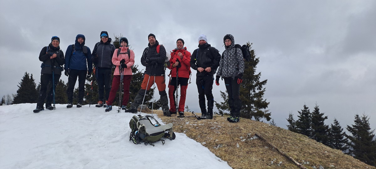 Veter se je na vrhu umiril, kot bi tudi sam priznal naš trud, zato smo si privoščili daljši počitek. V tišini smo vpijali razglede – mogočno severno ostenje Storžiča, oddaljene Julijce in razpotegnjeni greben Košute, ki so se v zimskem soncu zdeli skoraj nedosegljivi.