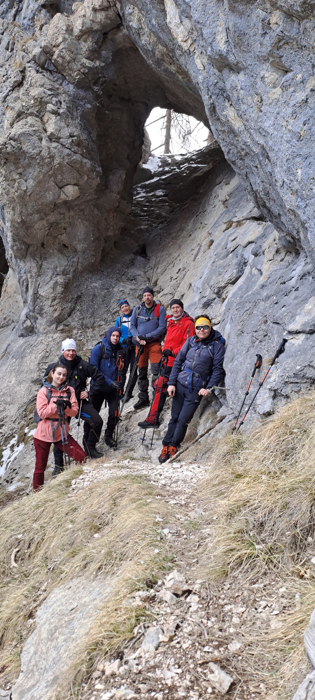 Sprva smo nadaljevali po grebenu, nato pa skozi gozd hitro sestopili do markirane poti proti Stegovniku, ki se vije pod ostenjem Malega Javornika. Po dobri uri hoje smo prispeli do znamenitih naravnih oken Stegovnika. Tam pa se je zgodba naše ture nepričakovano obrnila. Sneg je bil preglobok, strmina preveč izpostavljena, jeklenice, ki v kopnih razmerah nudijo varnost, pa so bile skrite pod zimsko odejo. Odločitev je bila jasna – vrh bo počakal. Obrnili smo se in po zahodni poti krenili nazaj proti izhodišču.