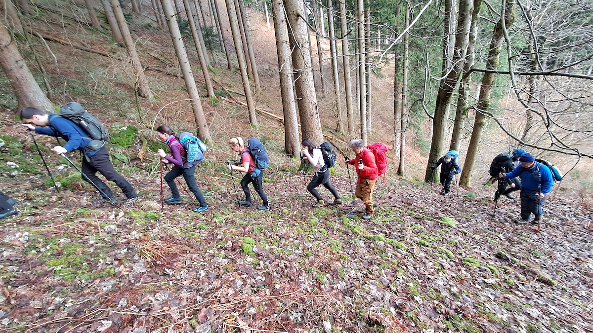 Ucvrli smo jo mimo taborniškega prostora in takoj zagrizli v strm gozdnat breg, ki so ga občasno prekinili kolovozi. Čeprav je bilo v zadnjem obdobju precej padavin, nam težav ni povzročal razmočen teren, temveč zaradi sečnje nekoliko slabše označena pot. Med krajšimi postanki človek kar ne more ostati ravnodušen ob čudovitih razgledih na Kamniško-Savinjske Alpe, ki so se bohotile v soncu.