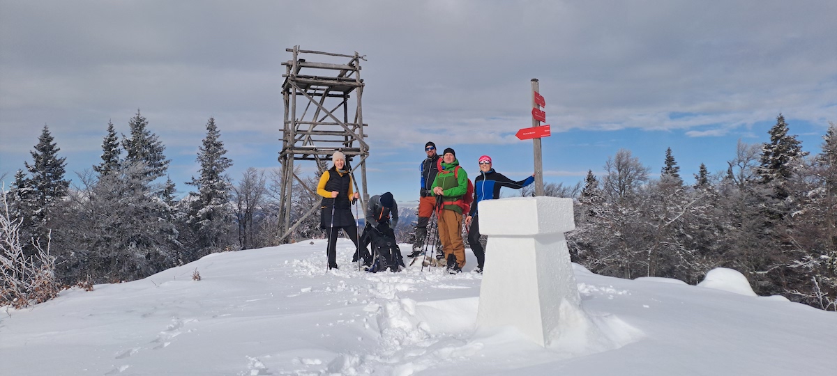 Z vzpenjanjem nas je počasi pozdravljala vse bolj planotasta pokrajina, odeta v deviški snežni plašč. Švignili smo mimo jame Vespa ter se najprej povzpeli na Špic, ki leži le streljaj od Doma na Menini planini, kjer smo si nato privoščili daljši odmor.