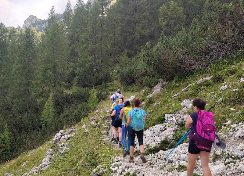Pot smo nadaljevali ob vznožju Jezerskega Stoga do opuščene Planine Jezerca in uživali v razgledu proti Ogradom in kmalu še na Adama in Evo.