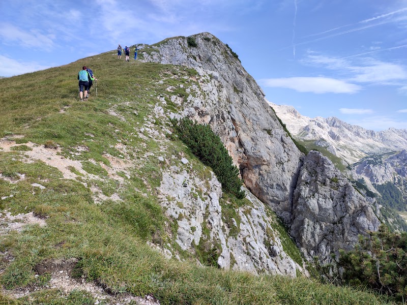 Pot smo nadaljevali s sestopom v skalnato dolinico med obema vrhovoma in jo tudi hitro dosegli. Za razliko od Adama, ki ima travnat vrh, je Eva poraščena z ruševjem. Tudi tu smo bili najprej skupaj, potem pa so se dekleta umaknila iz moškega vrha :)