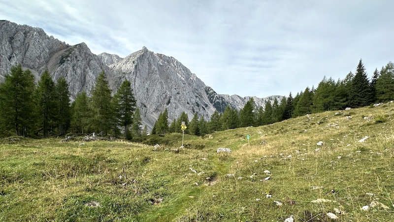 Na koncu travnika nas smerokazi usmerijo desno, na pot, ki kmalu preči hudournik, ob katerem se nato vzpnemo skozi gozd vse do jase.
