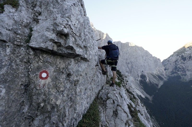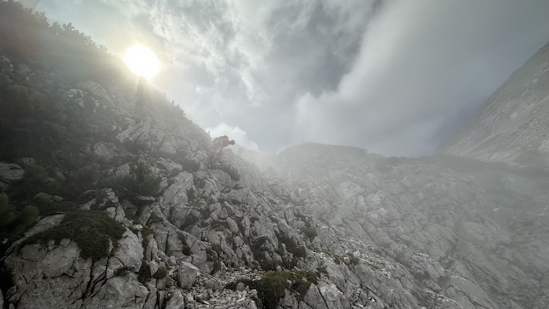 Greben do vrha Cmira je zares zanimiv kot je dinamičen. Na trenutke je spominjal na greben Košute v Karavankah, na eno stran trave in skale pod ne tako hudim naklonom, a na drugi pa odrezana stena v globine do same doline Vrat. Sledilo je prečenje Rjavčevih glav, gor in dol, spusti in vzponi po klinih in jeklenicah, da smo dosegli vrh Cmira. Rjavčeve glave še malo zelene, prijazne na pogled s planikami na poti, a Cmir popolnoma drugi svet, v skalo odet, kot police naložene po plasteh, kot da bi bil v sorodu z Mojstrovkami.