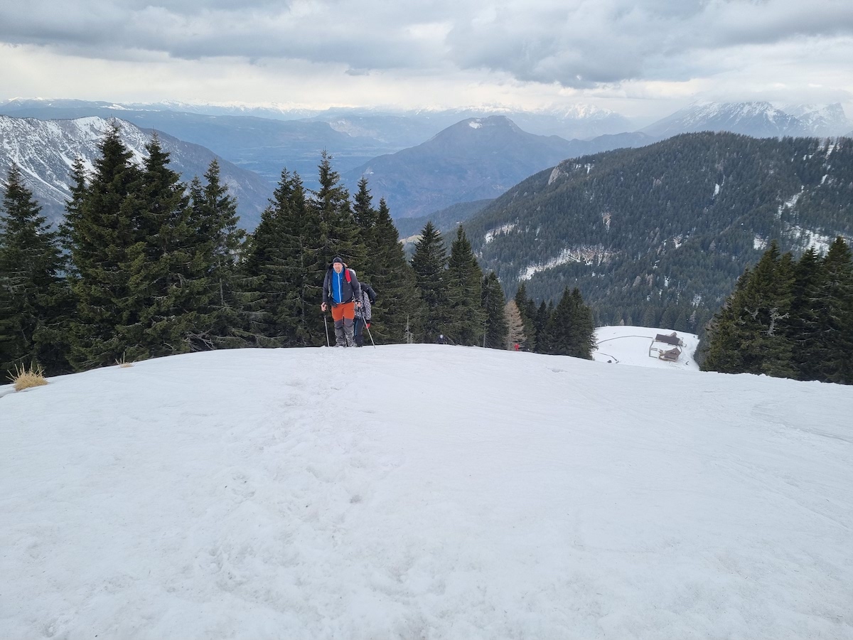 Veter se je na vrhu umiril, kot bi tudi sam priznal naš trud, zato smo si privoščili daljši počitek. V tišini smo vpijali razglede – mogočno severno ostenje Storžiča, oddaljene Julijce in razpotegnjeni greben Košute, ki so se v zimskem soncu zdeli skoraj nedosegljivi.